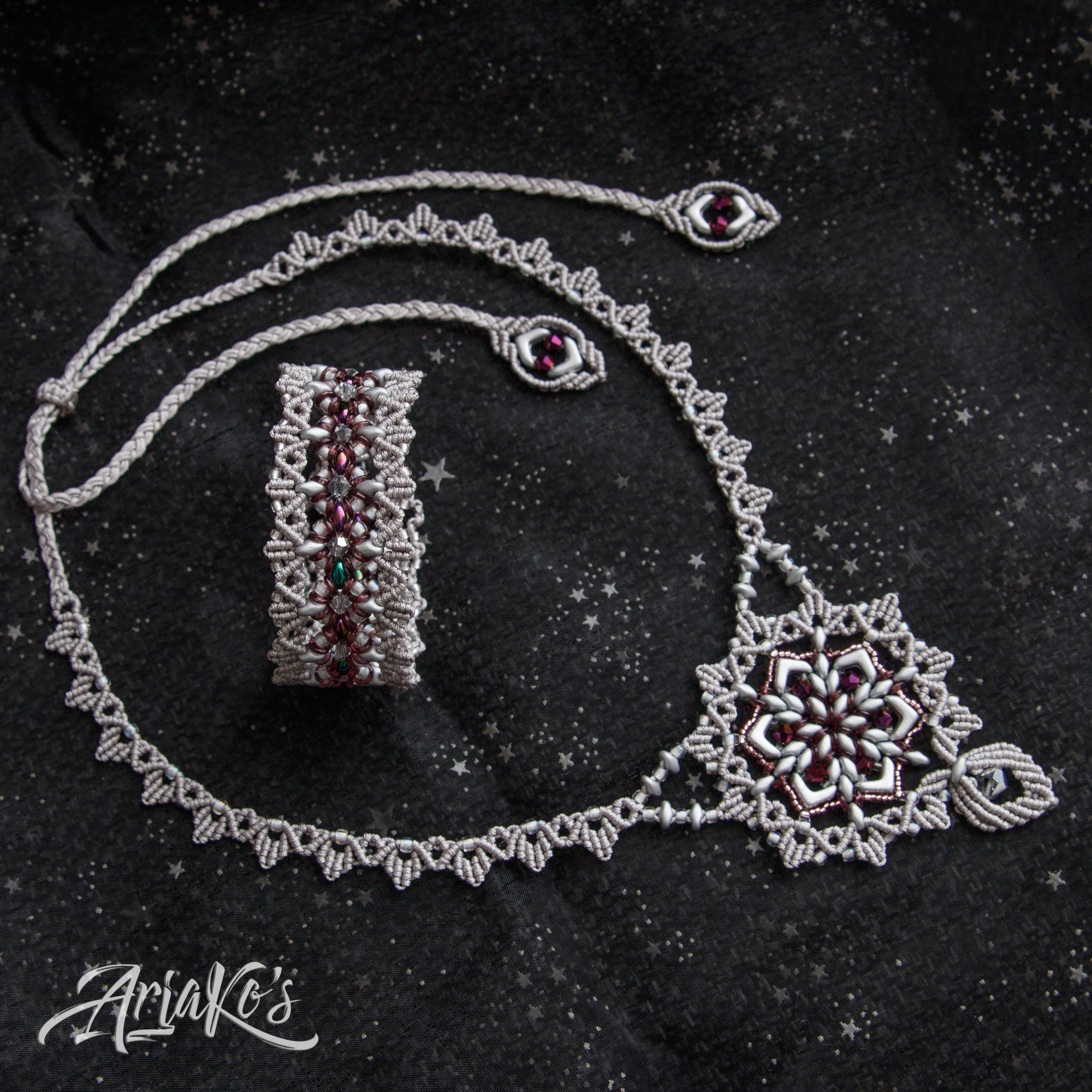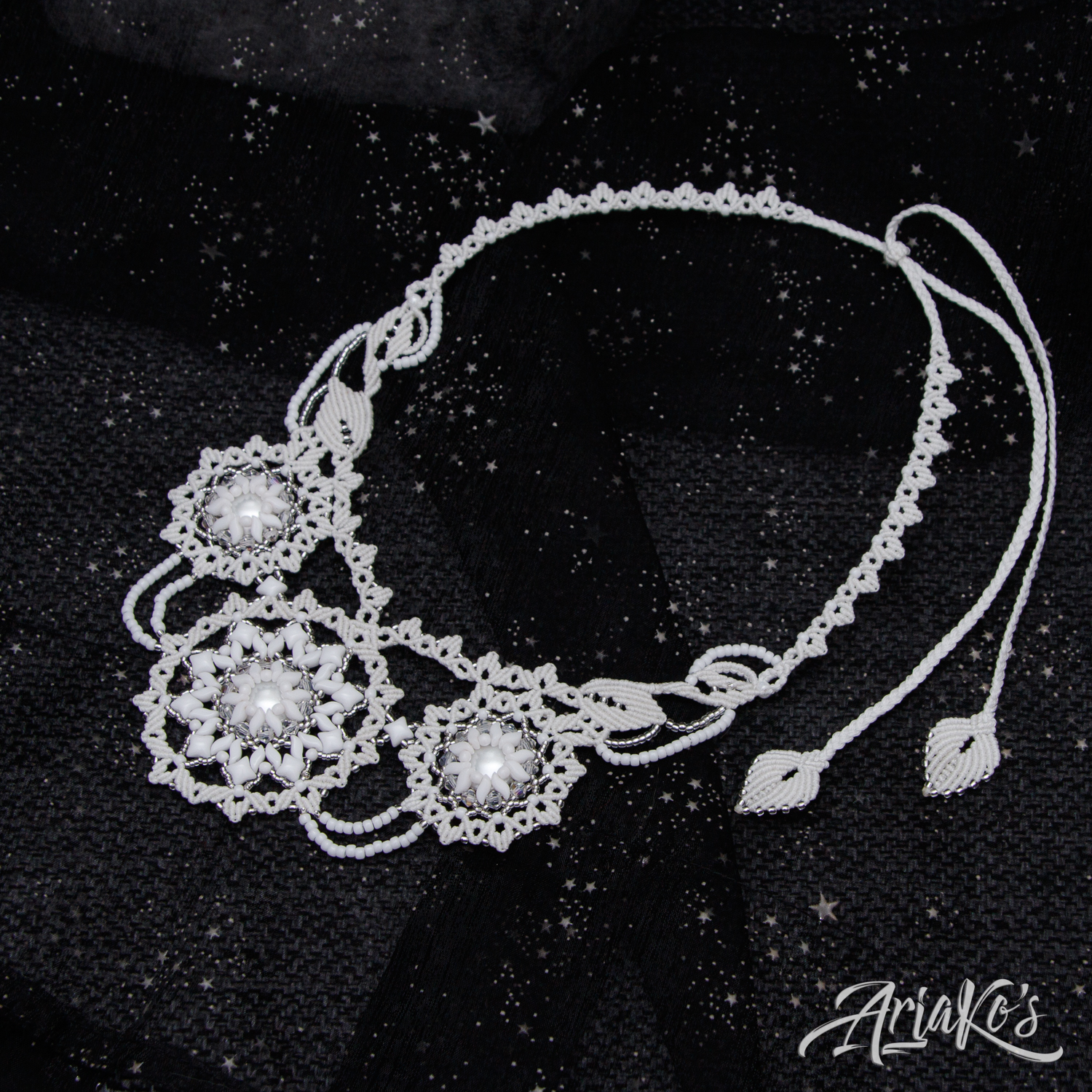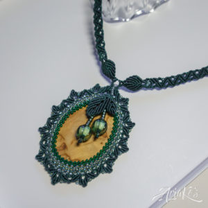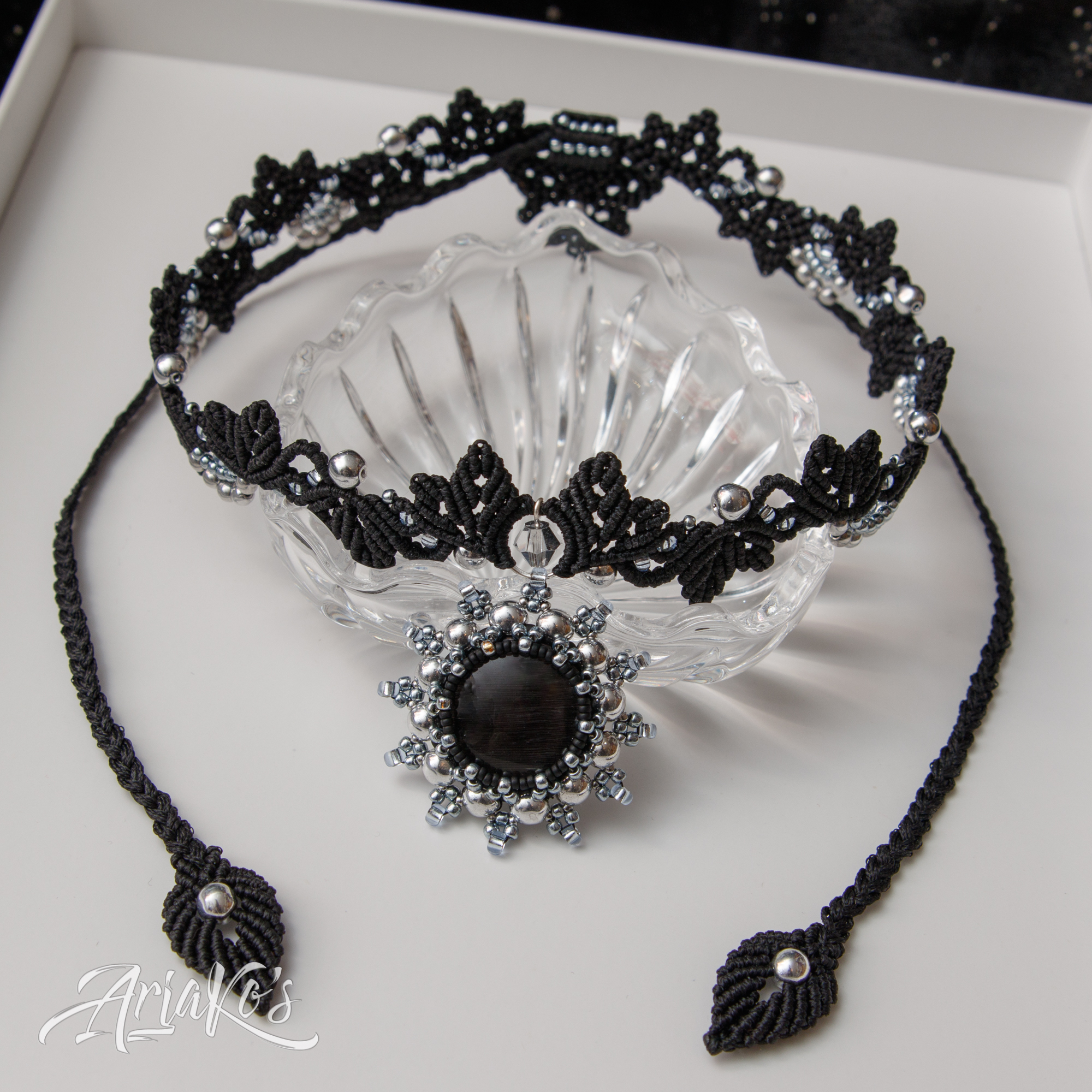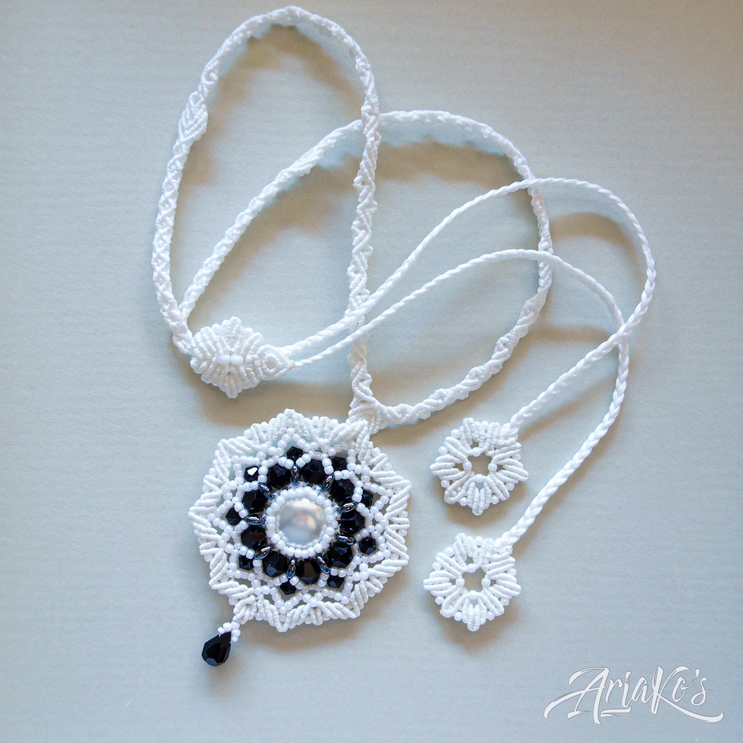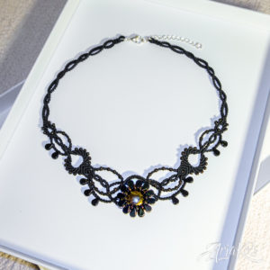Hybridisetti visakoivua, helmiä ja mustaa makrameeta.