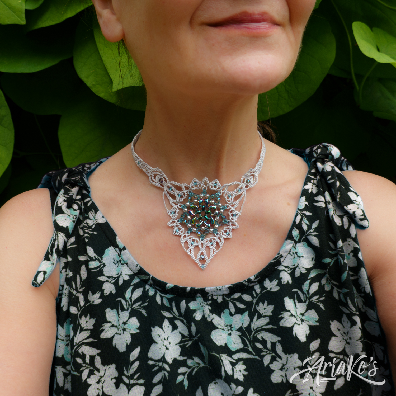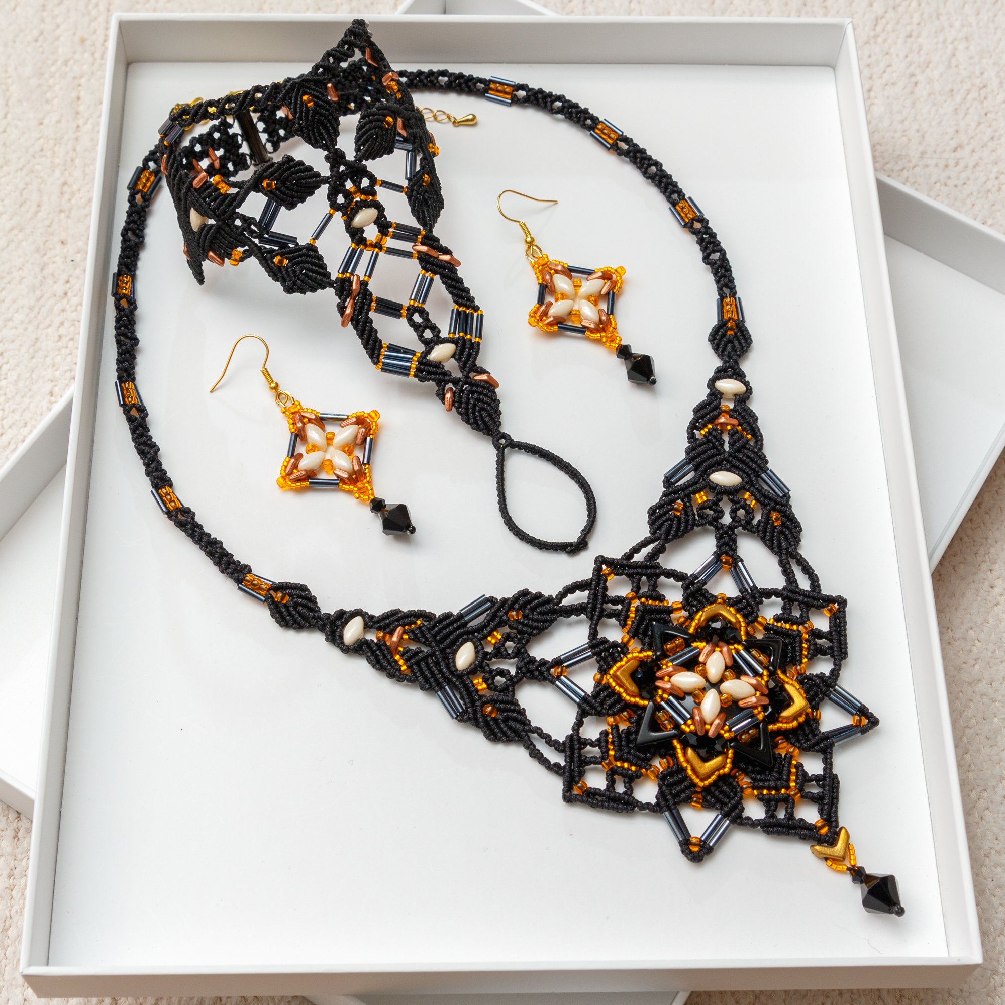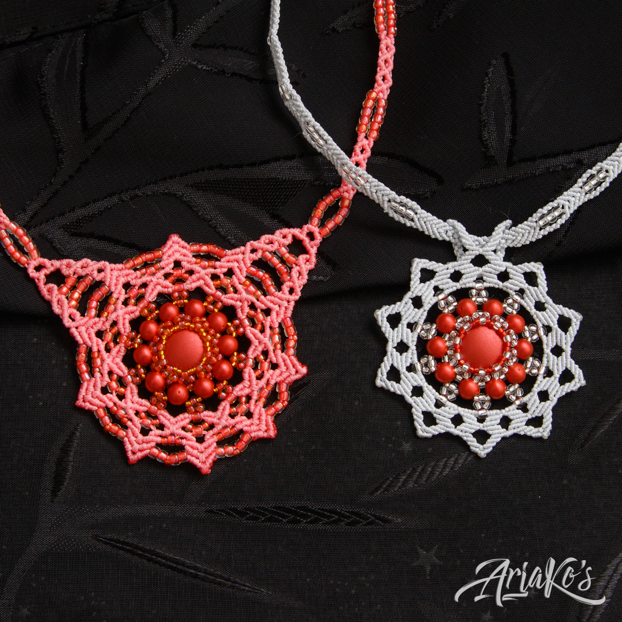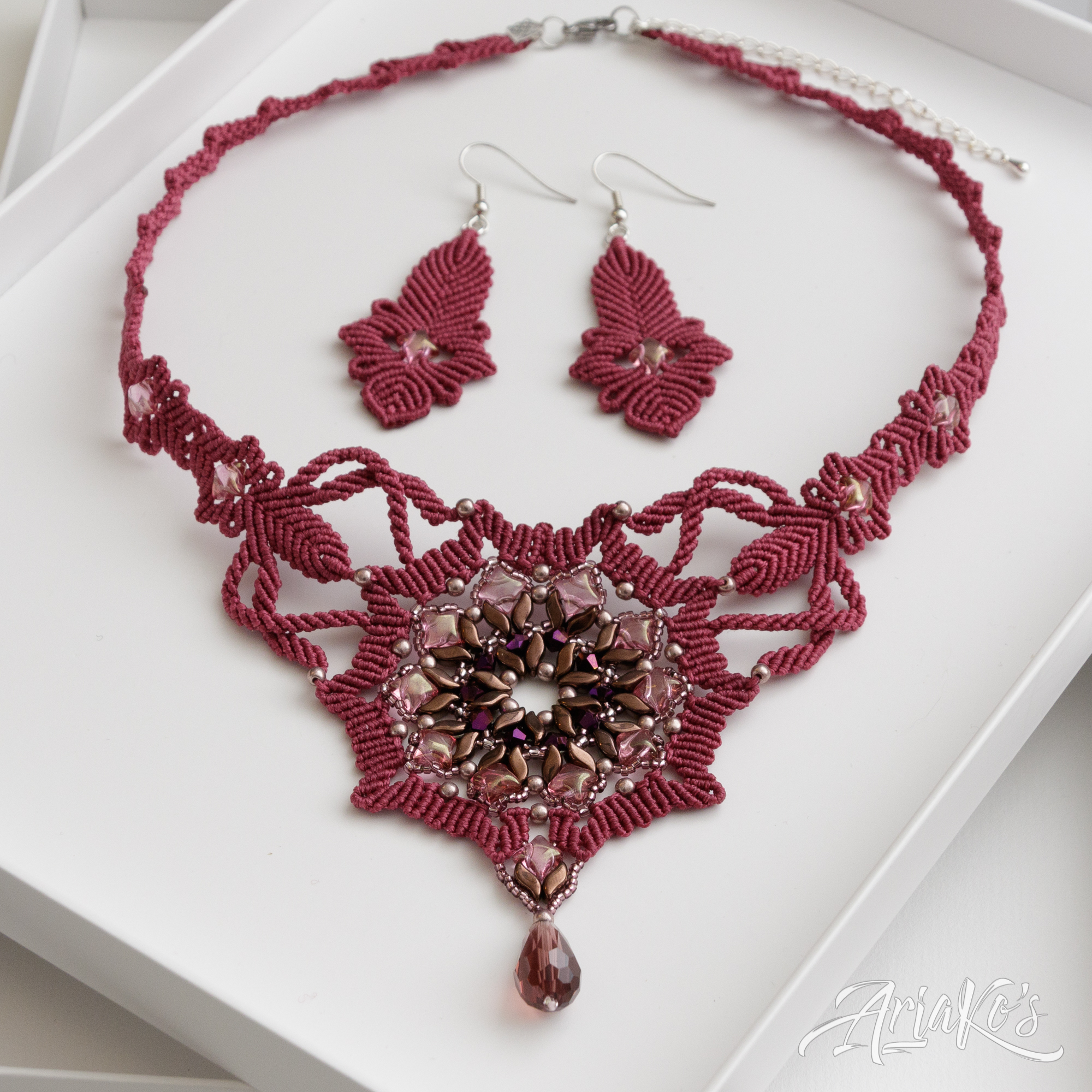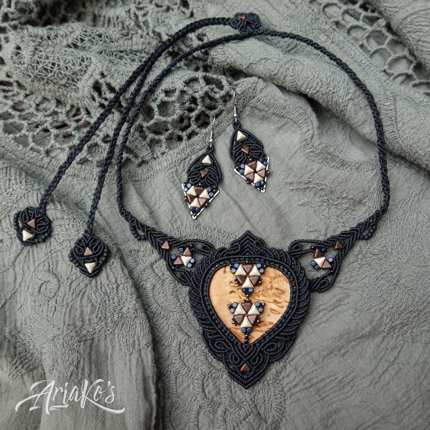 Hybridisetti visakoivua, helmiä ja mustaa makrameeta.