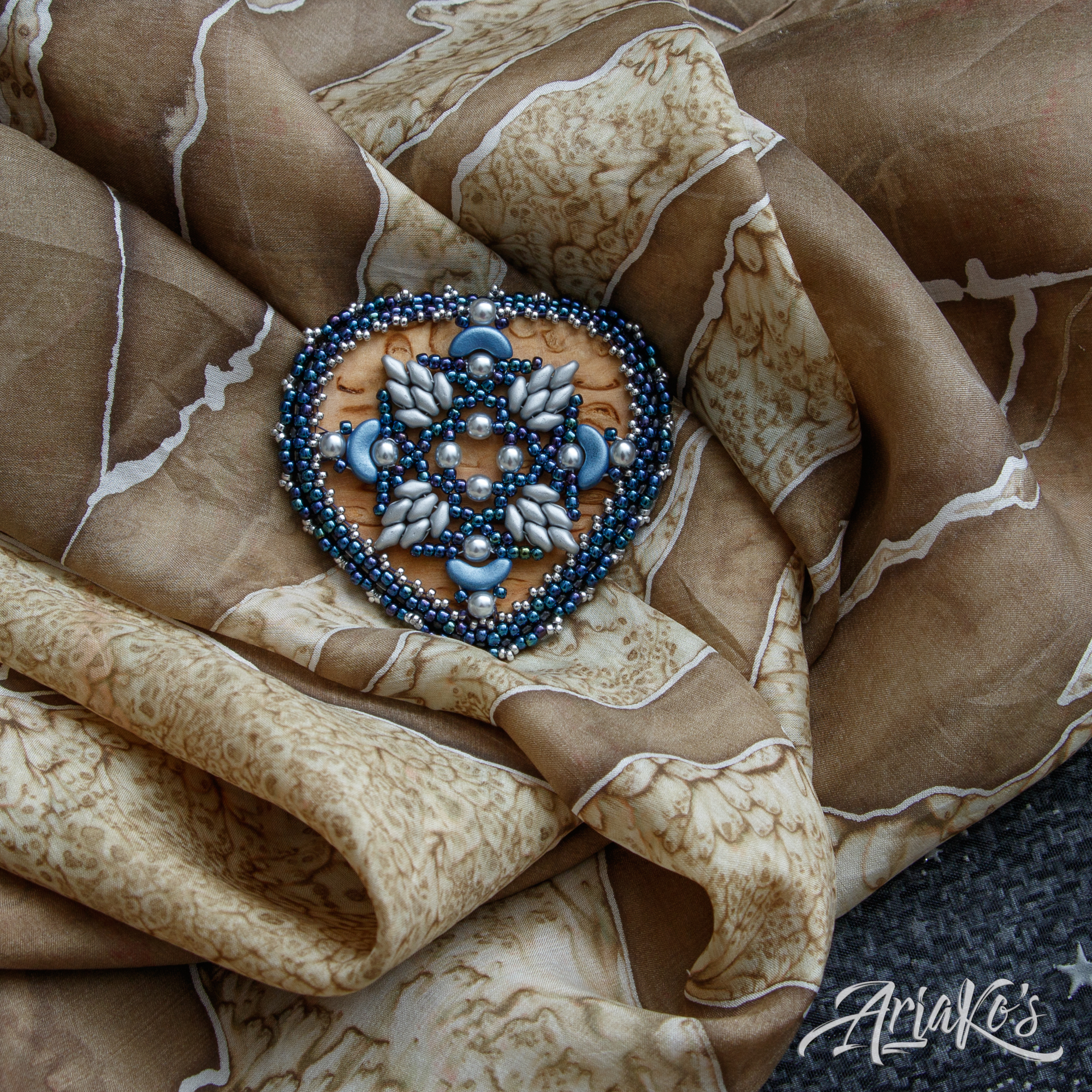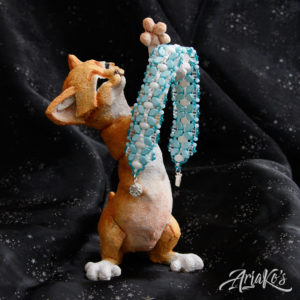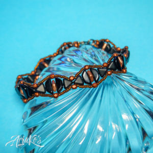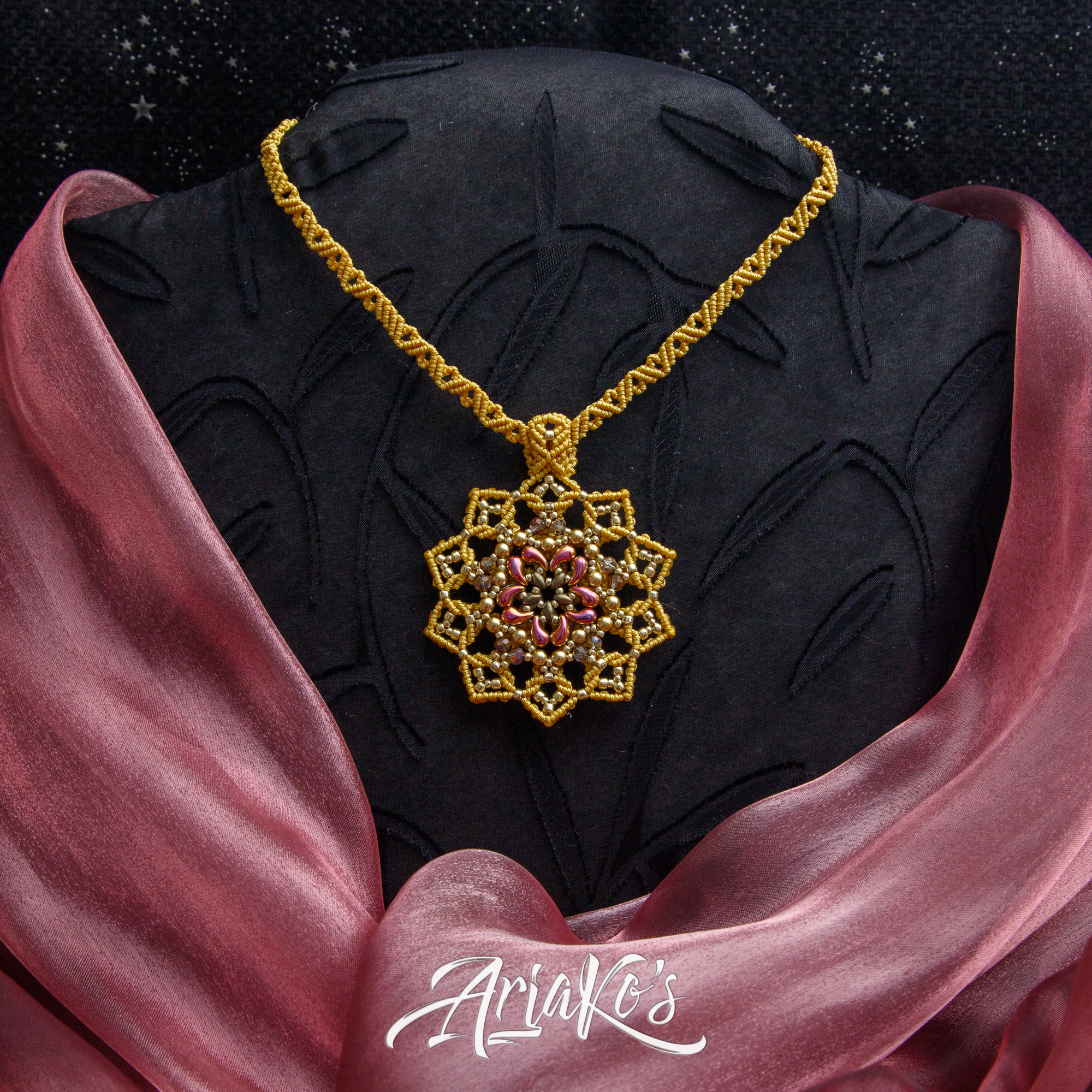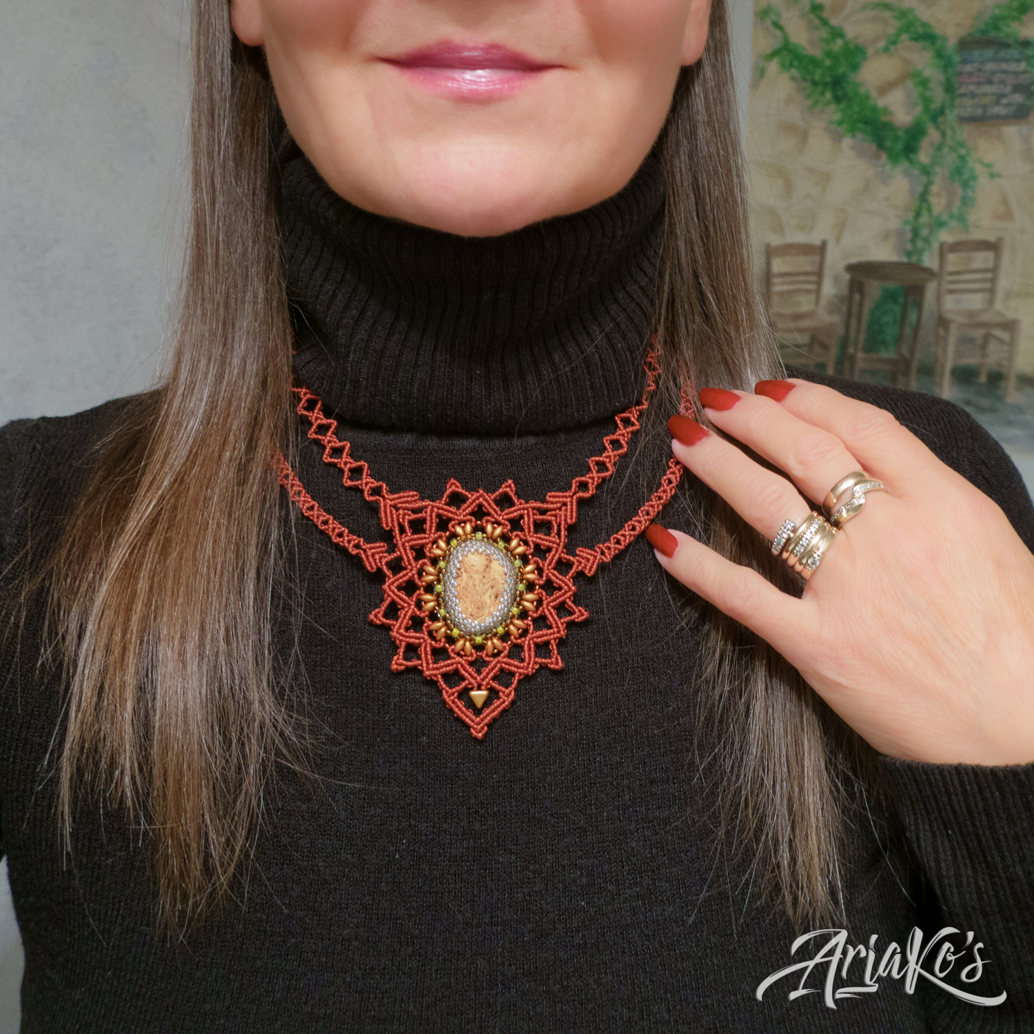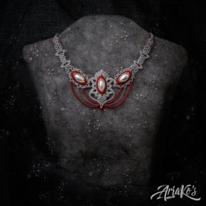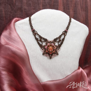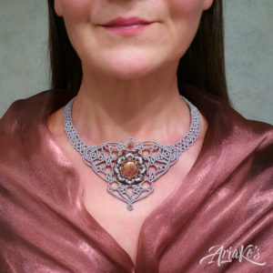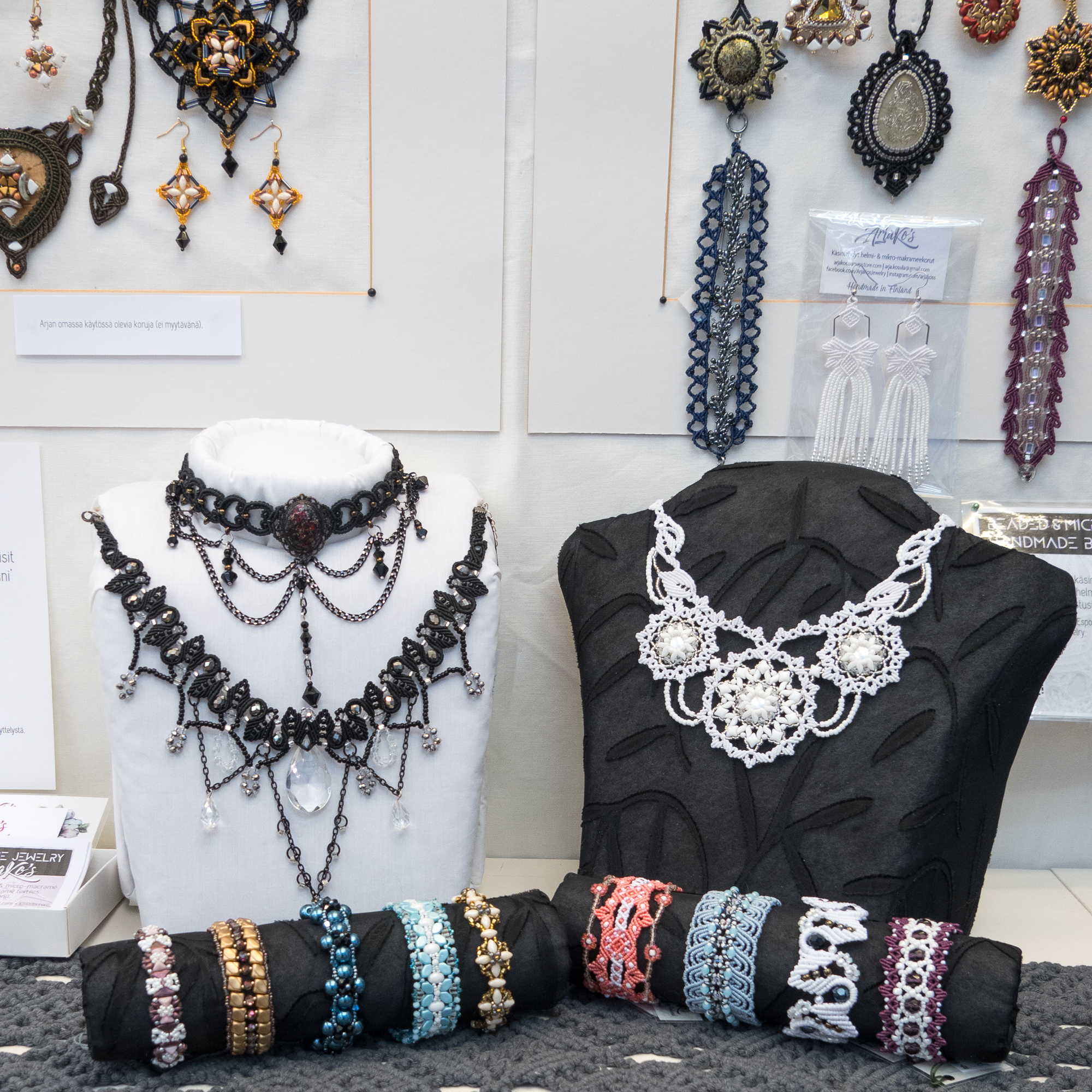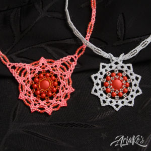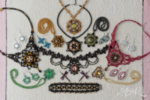 Yhä enemmän huomaan suuntautuvani helmipunontaan korujen teossa. Oma innovaationi on ”hybridi-korut”, joissa yhdistän kaksi eri tekniikkaa: helmipunonnan ja mikro-makramee-solmeilun. Hybridit eroavat siis tavanomaisista makramee-koruista siinä, että helmiosuudet kokoan erikseen ja solmeilut liitän niihin jälkikäteen, kun taas mikro-makramee-koruissa helmet pujotellaan solmeilulankoihin työn edetessä. Toisinaan mukaan tulee kolmaskin tekniikka eli kumihimo-punonta, jos riipukseen sopii paremmin punottu kuin solmuista koostuva kaulanauha.